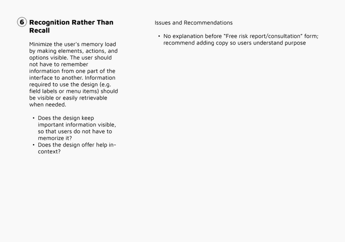 I provided UX consulting services for the website of a cybersecurity start-up, guiding the implementation of UX best practices. The principal work was an in-depth heuristics evaluation, shown here. I used Nielsen Norman's ten usability heuristics and noted which issues to prioritize based on the client's need to publish urgently. The prioritized issues included those that affected legitimacy and brand trust.